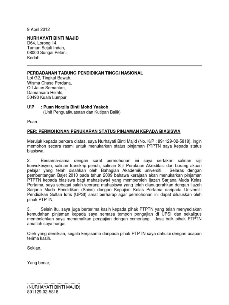Contoh Surat Permohonan Peryukaran Pinjaman Ptptn Ke Biasiswa